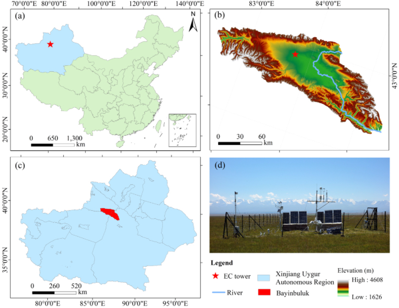 图1. 巴音布鲁克高原湿地地理位置(a,b,c)和本研究观测实验?。╠)