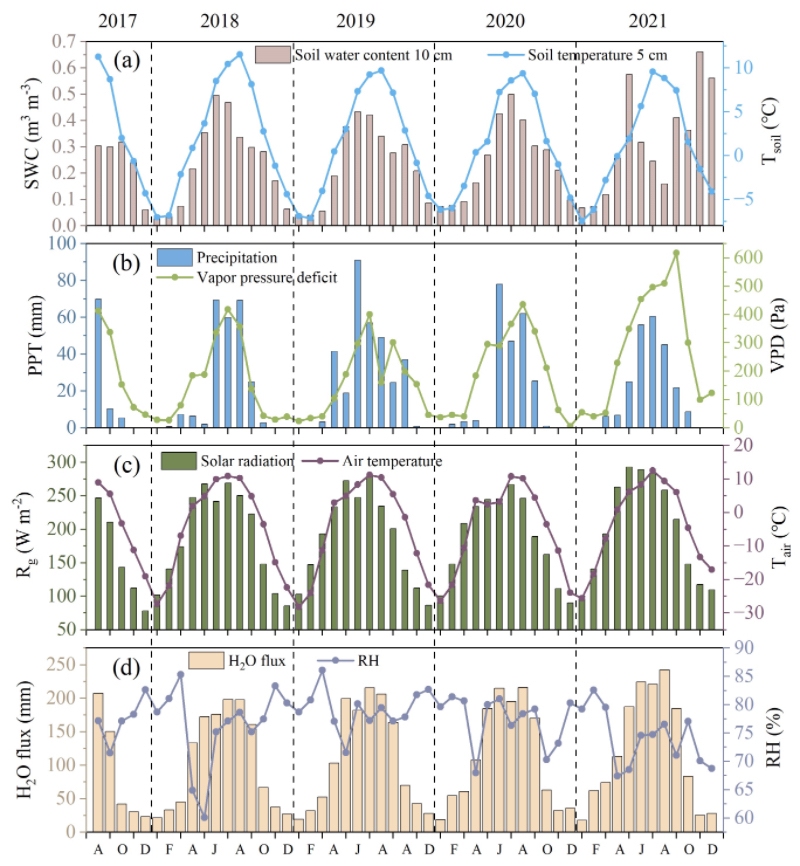 基于2017–2021年连续五年的涡度相关观测数据,发现巴音布鲁克高寒草地每年向大气中释放约1432毫米的水汽,远高于年降水量(237毫米),表明该草地是水汽的净源区。研究同时显示,该地区水汽通量具有明显的季节与日变化规律:生长季(5–9月)通量显著高于非生长季,日峰值出现在下午2:30左右。通过小波分析与主成分分析进一步明确:太阳辐射、气温、土壤温度和饱和水汽压差是控制水汽通量的主要环境因子(图2)。更为重要的是,尽管降水量和温度在五年期间没有显著增加,年蒸散量却以每年100毫米的速度上升,表明气候变暖正在加剧该地区的水分亏缺,进一步推动干旱化进程。