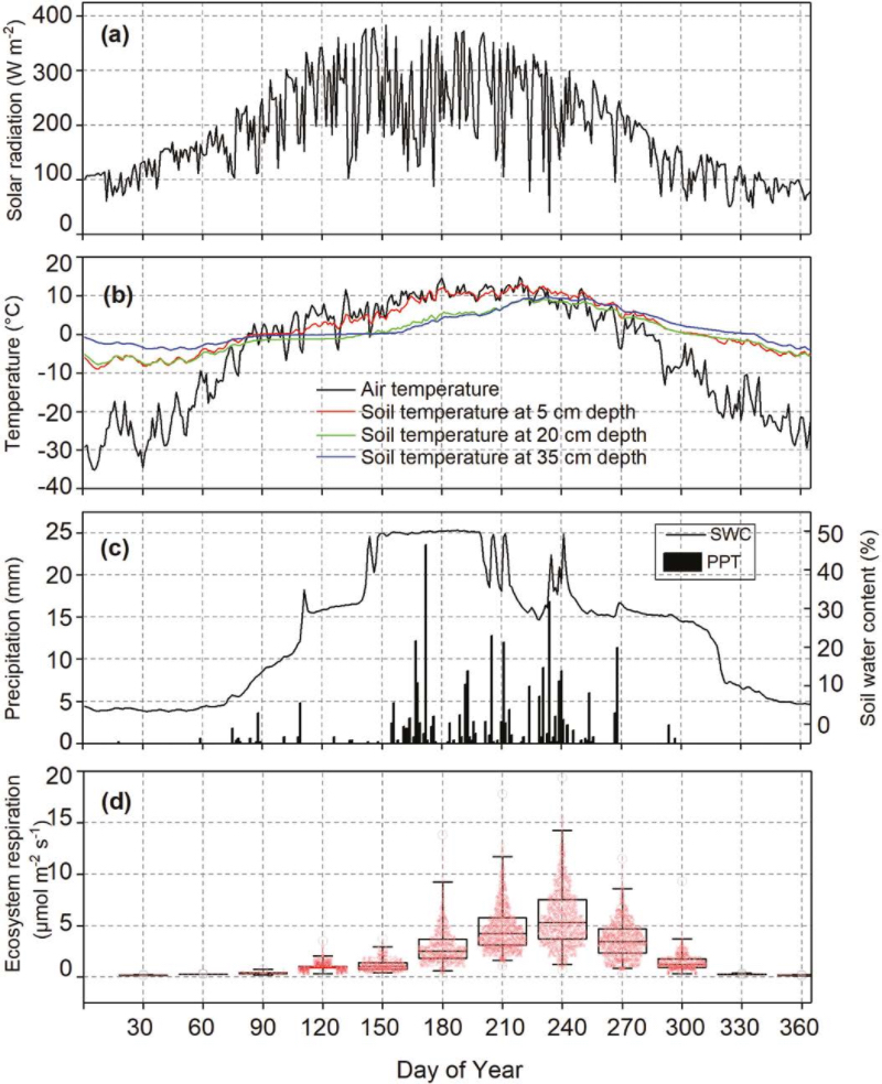 图3. ER和环境变量的时间序列:(a)日平均太阳辐射;(b)距地面2 m的日平均温度和5、20和35 cm深度的日平均温度;(c) 10cm深度的日平均SWC和半小时PPT;(d)内质网通量(中位数、平均值、第25 /75百分位数、第10 /90百分位数、阈值分别以实线、方形、箱形、须状和圆形表示)。