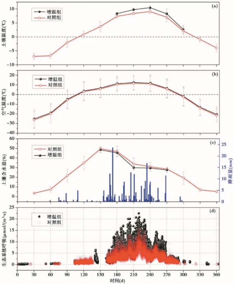 图4. 土壤温度(a)、气温(b)、土壤含水量(土壤深度均为5cm)(c)和生态系统呼吸(d)在 OTC 组和对照组中的变化。误差线代表标准偏差。
